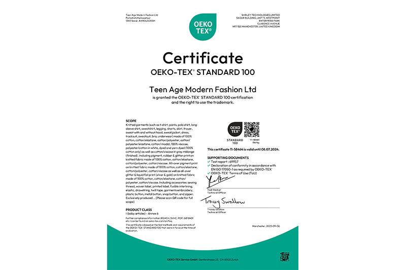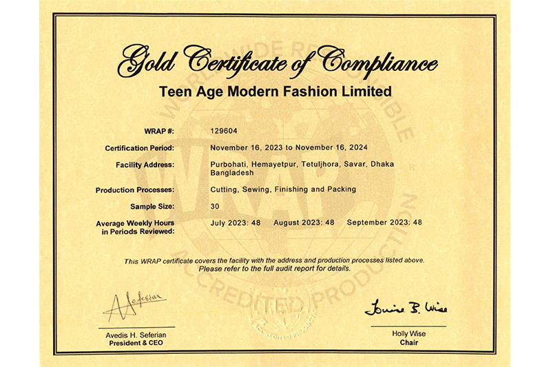 The goal is to exceed requirements of local legislation and reach the global standards, and thereby support clients’ images and sourcing principles. Clearly demarcated emergency routes & exits, smoke & fire detectors, consciously designed working lay-outs ensure a safe workplace for workers. As per ISO requirements, instructions and warning signs are posted in highly visible places, inside the factory and in local language (Bangla).Moreover, usage of metal gloves in times of fabric cutting, needle guard in time of sewing and such similar procedures reduces significantly work-related accidents in Teen Age Modern Fashion Limited. Besides being safe, Teen Age Modern Fashion Limited workplace offers a congenial & supporting environment for all: managerial staffs and workers work in mutual cooperation and respect. Teen Age Modern Fashion Limited consciously puts effort to empower woman not only by just recruiting more women in workforce, rather by undertaking some assertive programs to train & promote women in the higher levels. Read More..